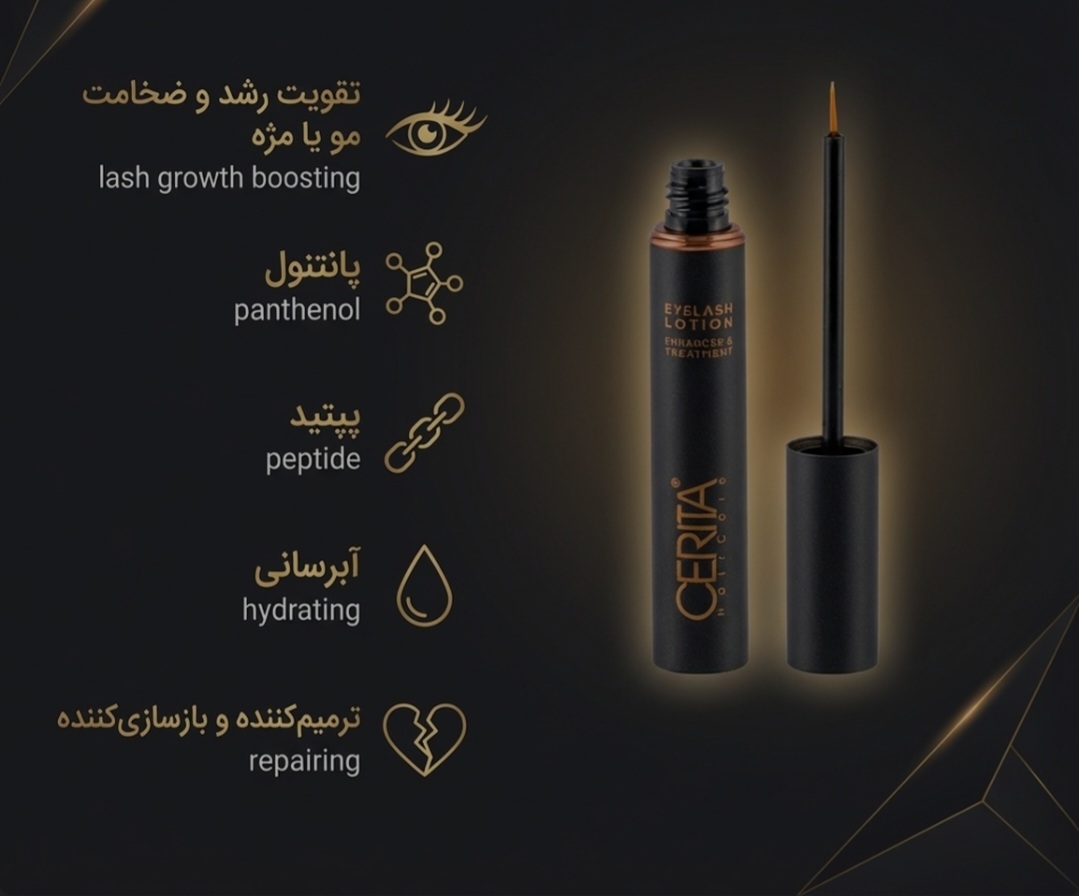 محلول تقویت کننده مژه سریتا مدل Eyelash special است. حجم 8 میلی لیتر است. محلول تقویت مژه سریتا یکی از تاثیرگذارترین محصولات برای تقویت و افزایش رشد مژههاست که از بدو تولید تاکنون مورد توجه بسیاری بوده و خود را در این زمینه ثابت کرده است. این محلول تخصصی با داشتن فرمولاسیون خاص و قوی میتواند فاز رشد مژه را طولانیتر و زمان ریزش طبیعی آن را کاهش دهد و از همین جهت برای کسانی که دچار ریزش مژه هستند یا دوست دارند مژهای پرتر و بلندتری داشته باشند بهترین انتخاب محسوب میشود. در ادامه بیشتر با محلول تقویت کننده مژه سریتا مدل Eyelash special حجم 8 میلی لیتر آشنا میشویم. ویژگیهای محلول تقویت کننده مژه سریتا است. محلول تقویت مژه سریتا یک محصول کاملا تخصصی است و به جرئت میتوان گفت بیشترین محبوبیت را بین سایر محصولات برای تقویت مژه دارد. این محلول برای افزایش طول و ضخامت مژهها و درمان ریزش مژه و همچنین پرپشت کردن مژها مورد استفاده قرار میگیرد. محلول تقویت کننده مژه سریتا مدل Eyelash special حجم 8 میلی لیتر دارای مواد موثر با کاراییهای مختلف است که استفاده از آن را اثربخش کرده است: بیماتوپروست به رشد مژه کمک بسیاری میکند و فاز طبیعی ریزش مژه را کمتر میکند. این ماده همچنین سبب پرپشت شدن مژهها میشود. شبدر قرمز دارای خواص آنتی اکسیدانی است و به تغذیه و تقویت فولیکولهای مژه کمک میکند و با افزایش خون رسانی به رشد مژهها کمک میکند.ویتامینB7 و B5 از خشکی مژهها جلوگیری میکنند و به ترمیم و بازسازی مژهها کمک میکنند، به علاوه با افزایش تولید پروتئین در بن مژه خاصیت تقویتی دارند. آلوئه ورا در تقویت کننده مژه سریتا اثر رطوبت بخش دارد و مژههایی شاداب بدون خارش و التهاب را به وجود میآورد.